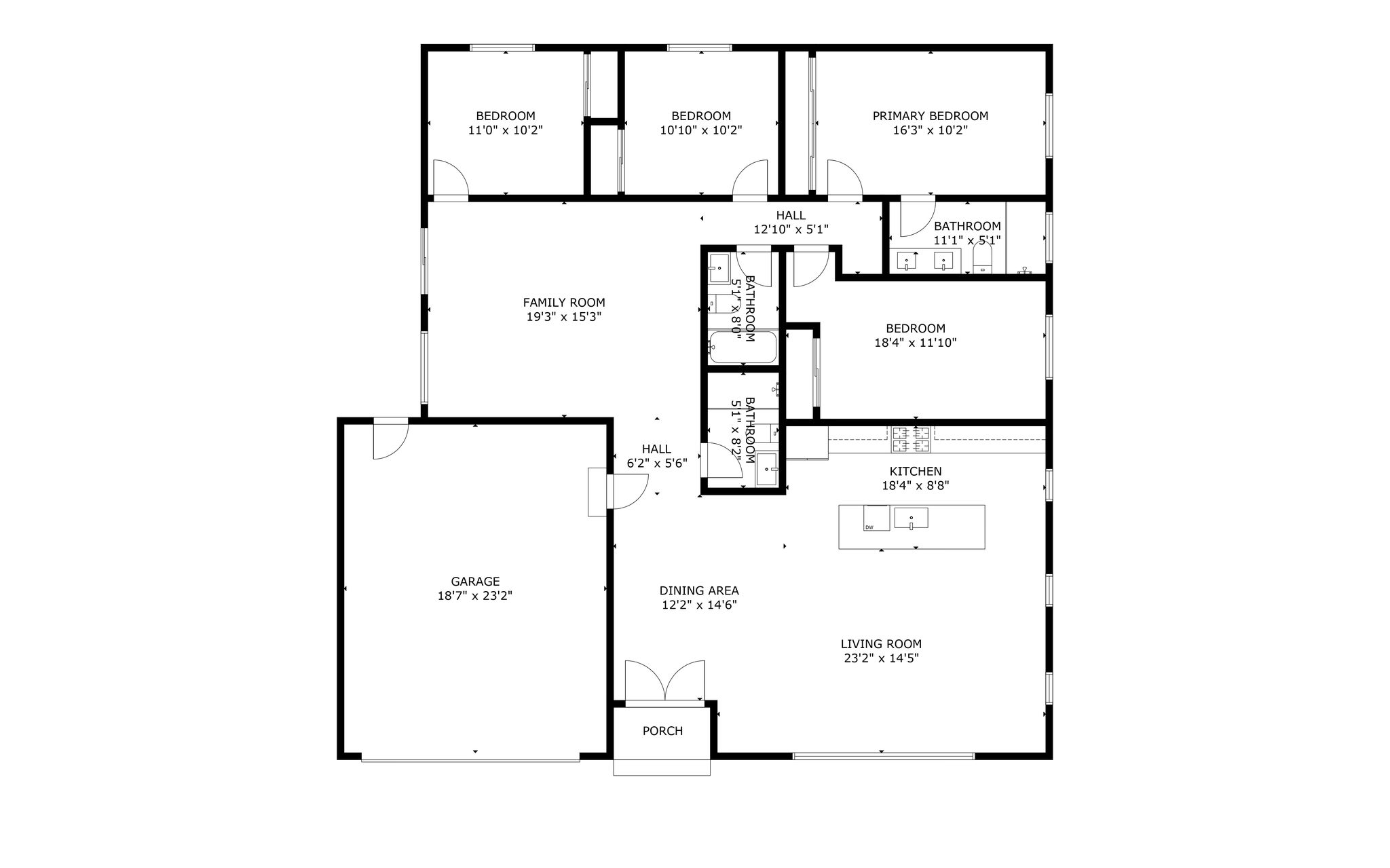 a full bath for convenience. At the rear of the home are the four bedrooms,