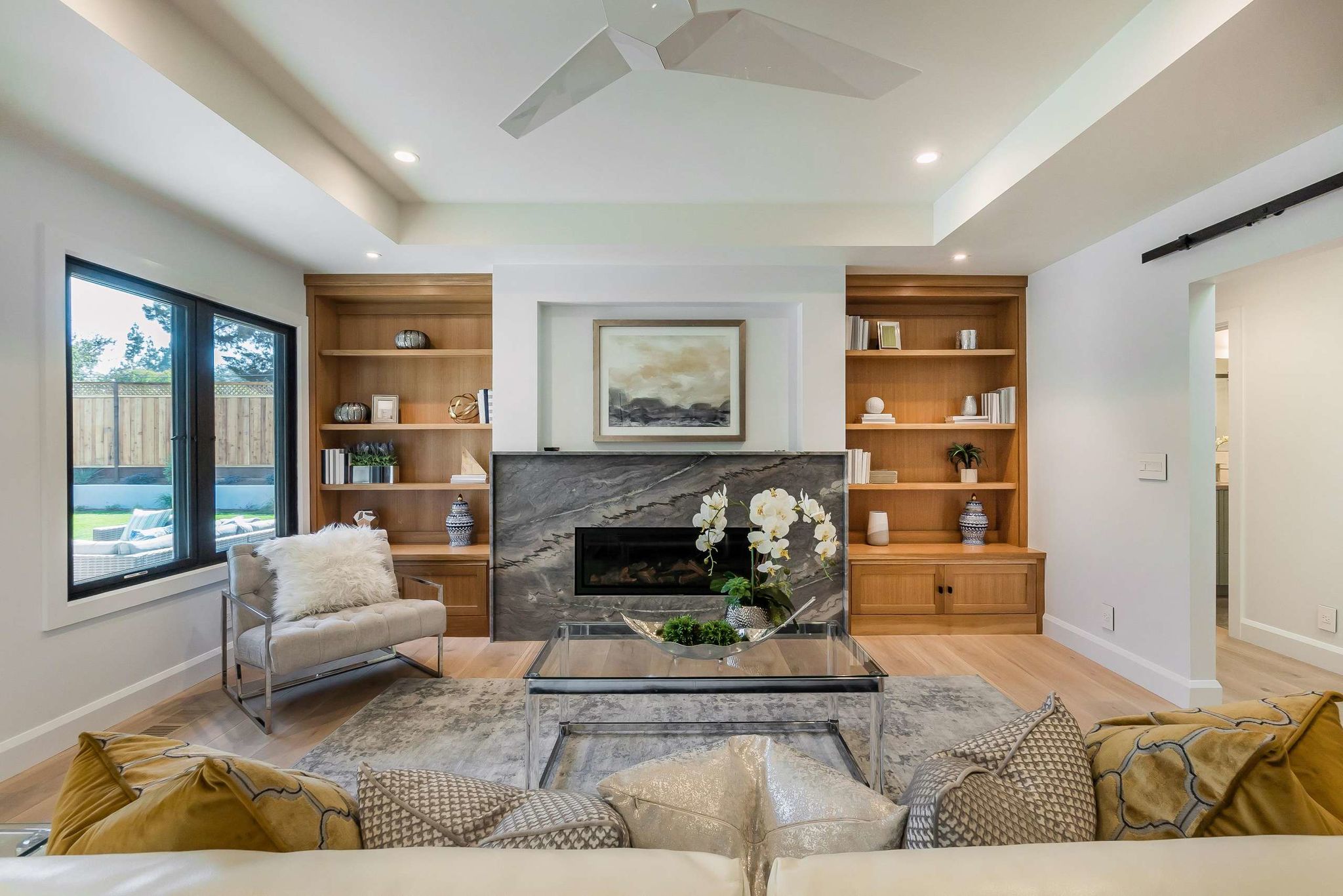 barn doors is the cozy family room with fireplace, built-ins, tray ceilings