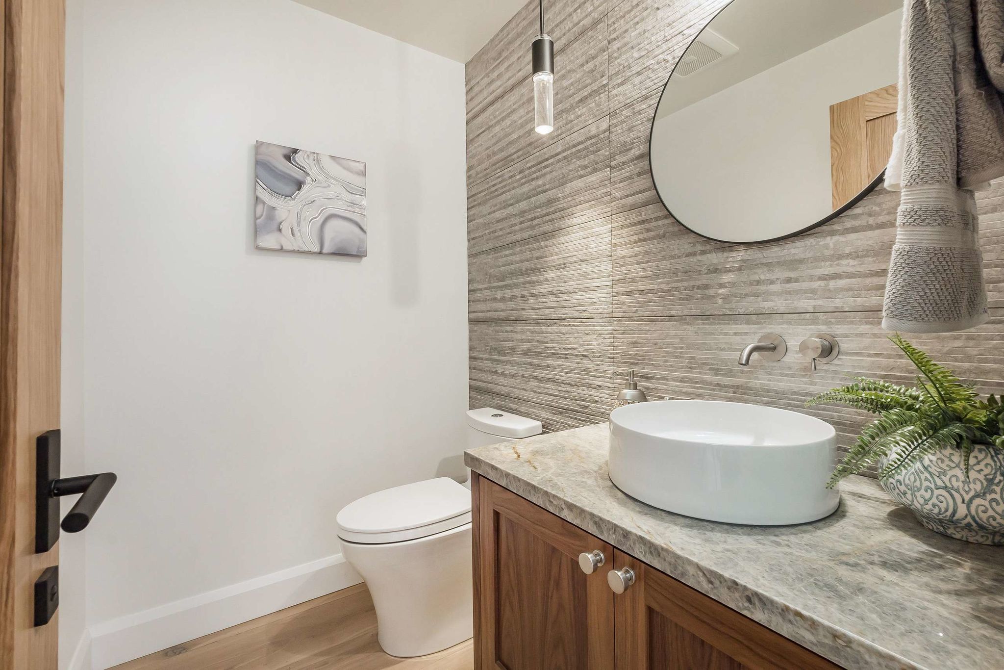 fireplace with floor to ceiling quartzite slab & vaulted ceilings. An