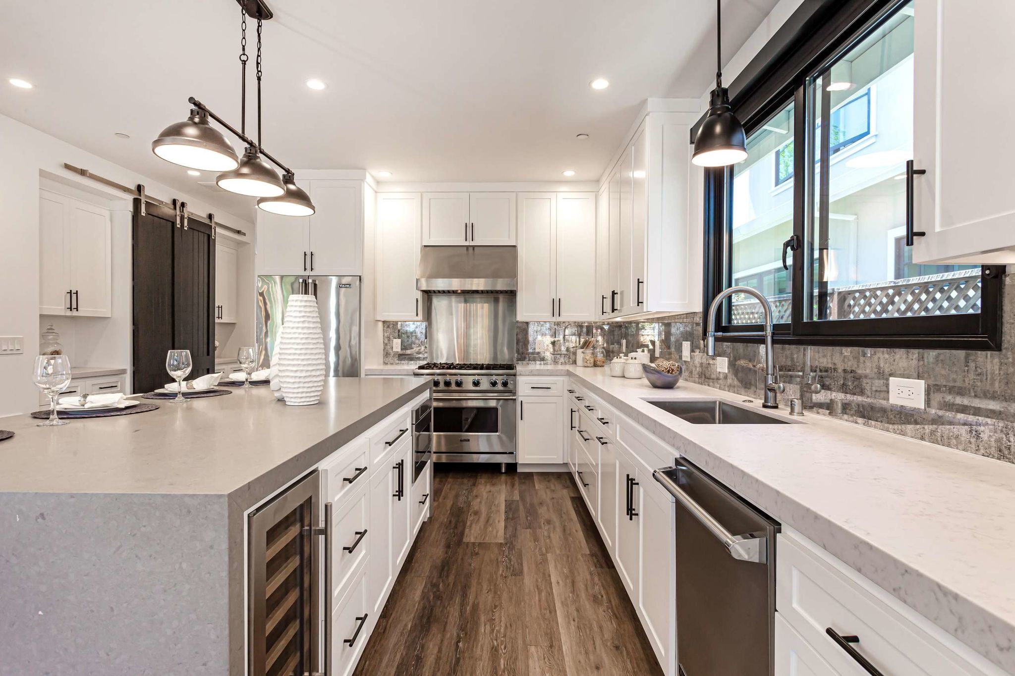 functionality. Also notable are a pantry with sliding barn doors, a wine