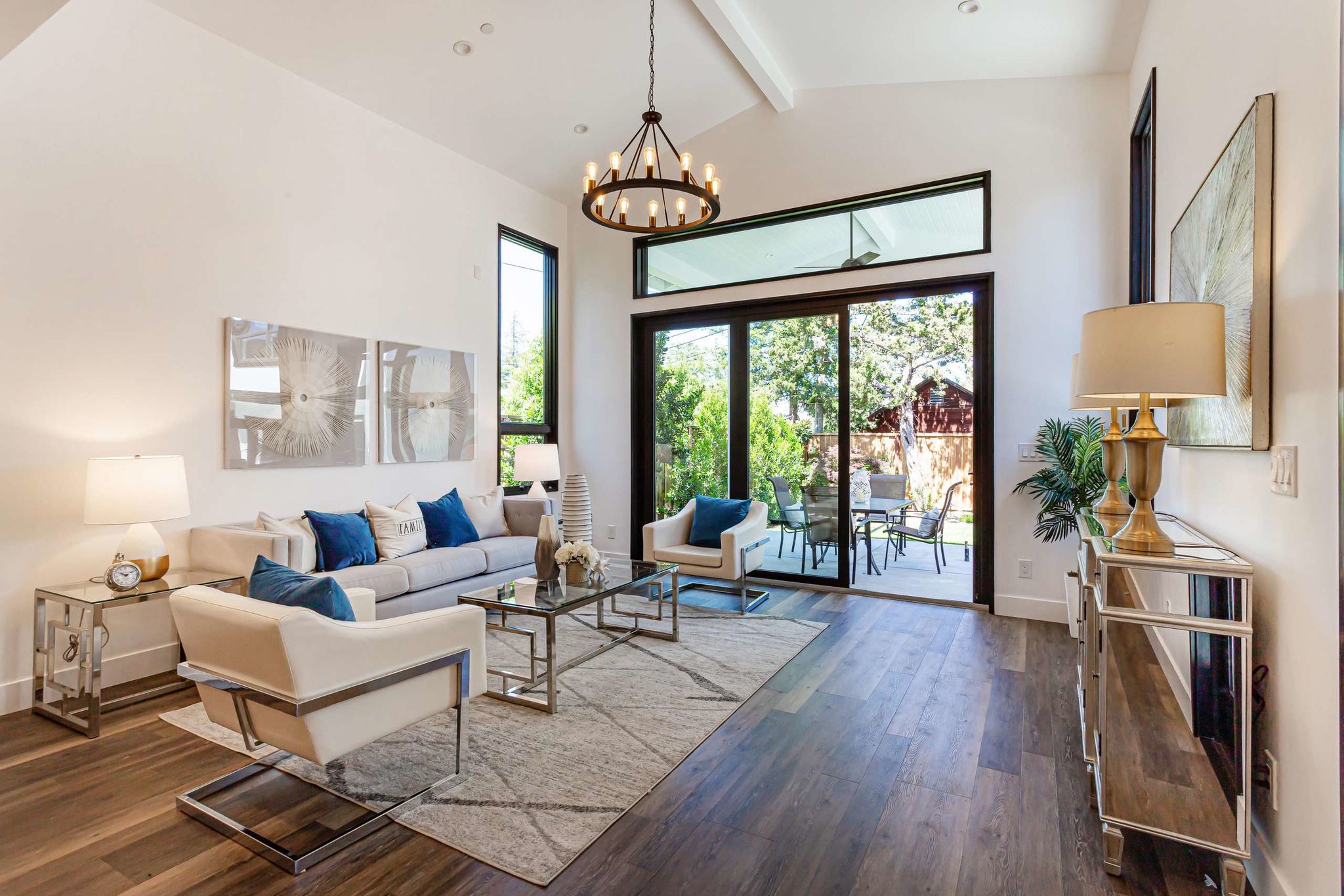 The great room has vaulted ceilings and Panoramic doors opening to the covered