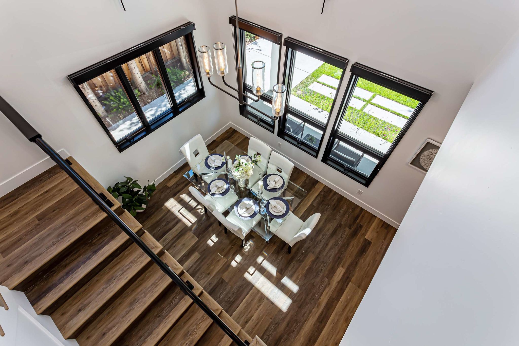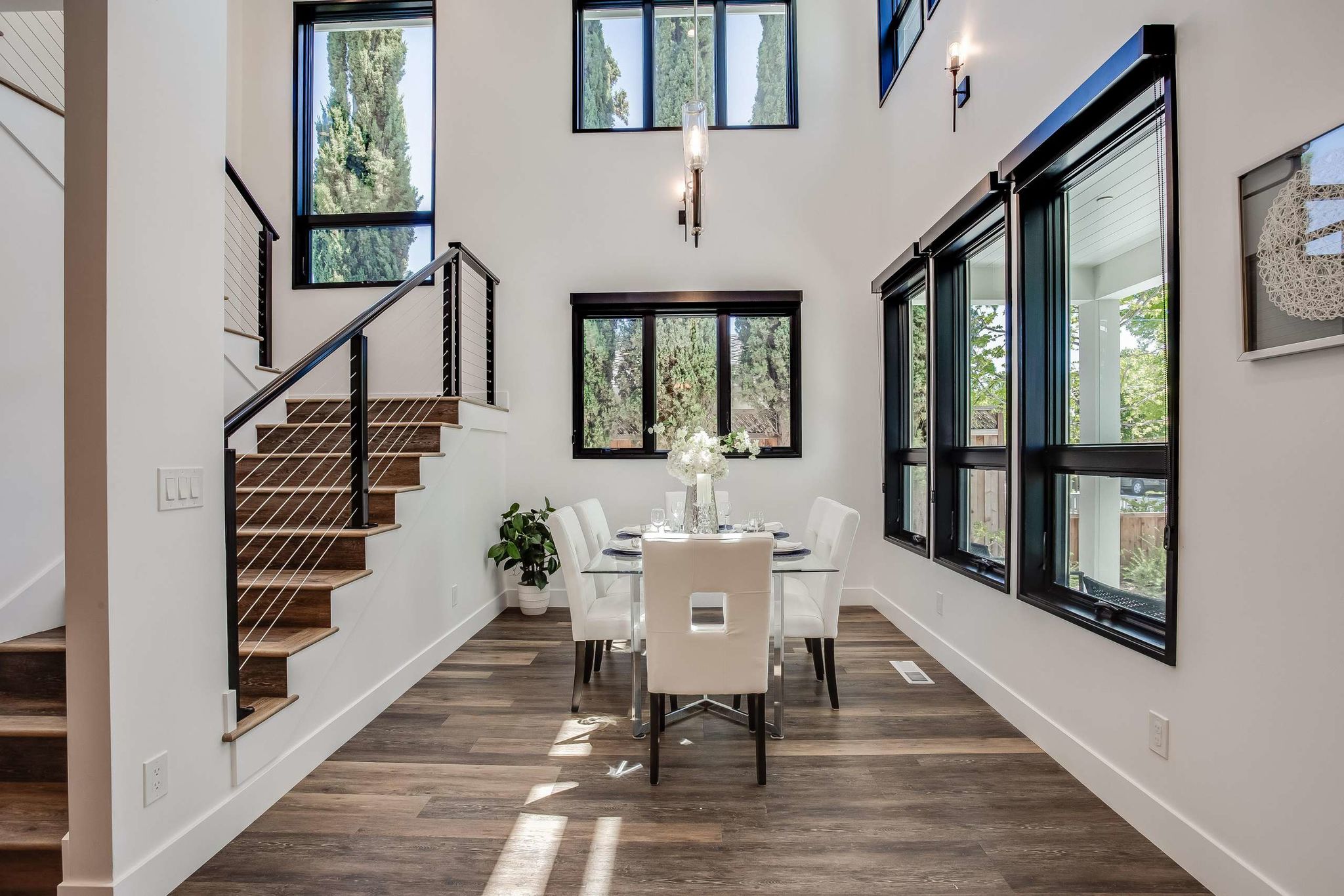 grand dining room with 18-foot ceilings, walls of windows, and impressive