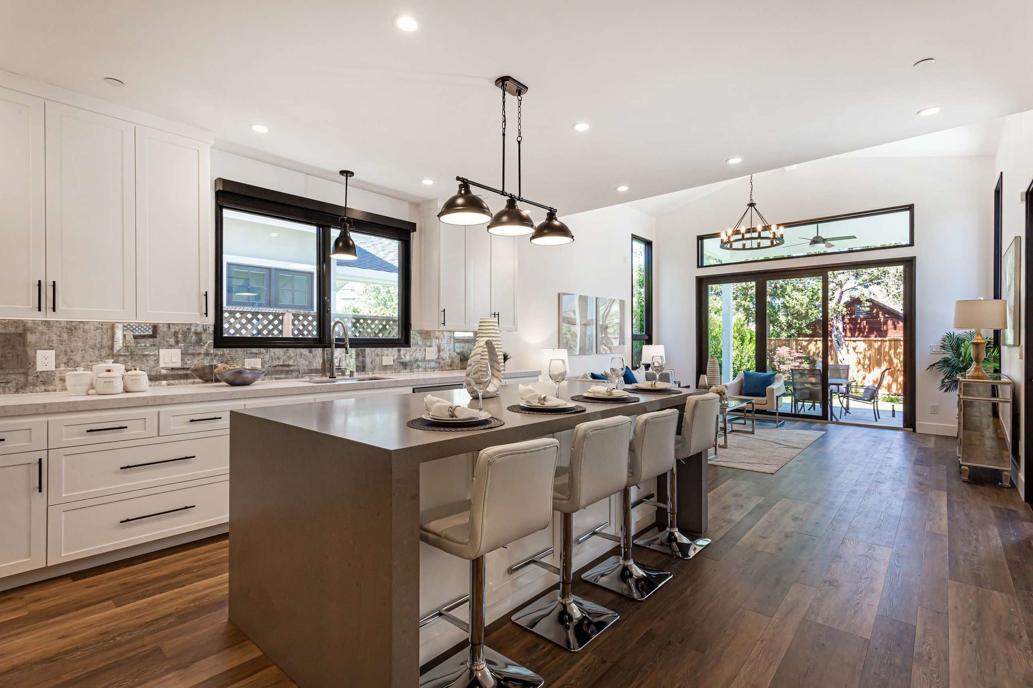 large island with waterfall quartz countertops and breakfast bar, while a top