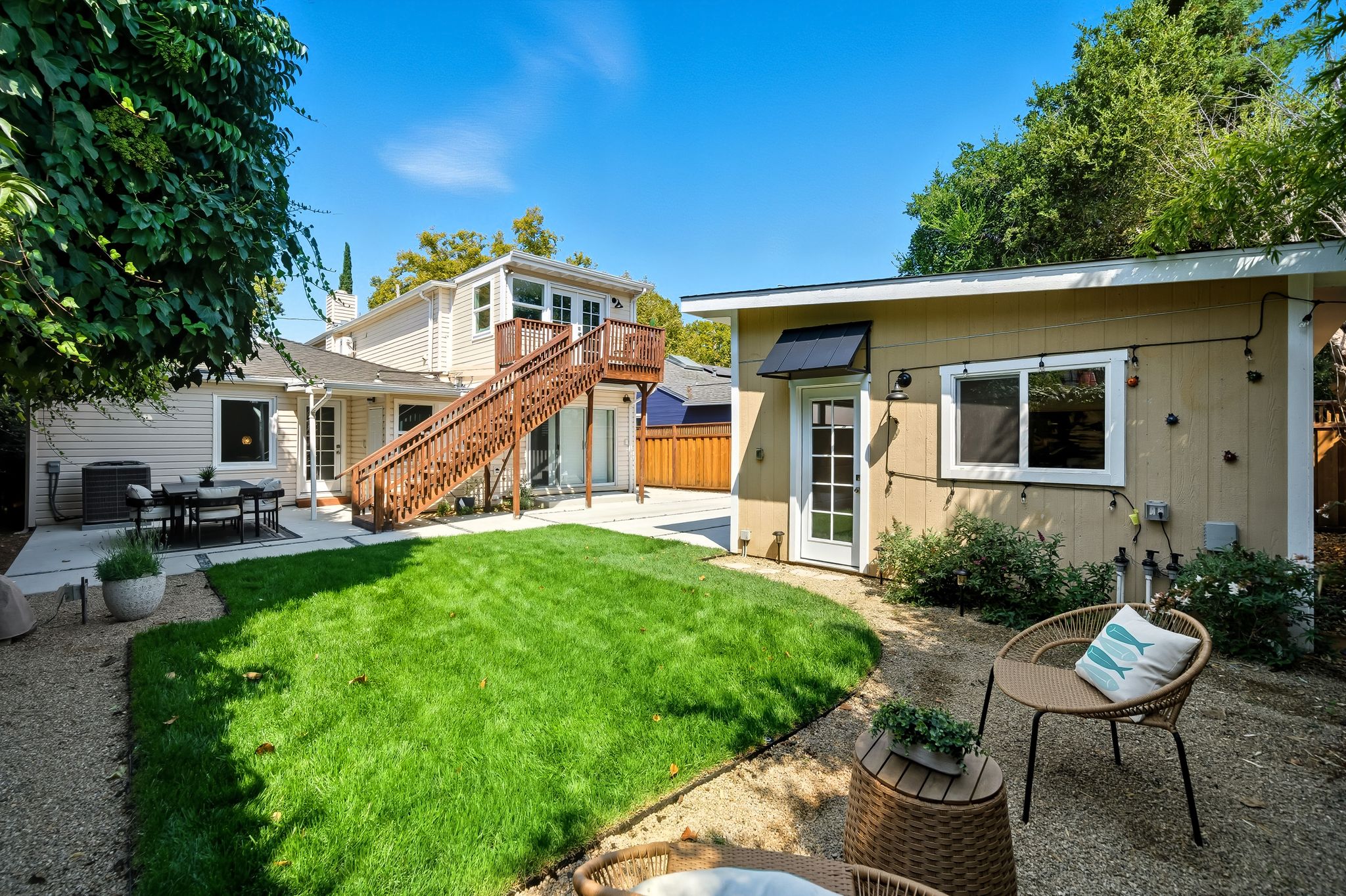 精美的后院设有草坪、大型露台和储物棚。距离红木城市中心、Co