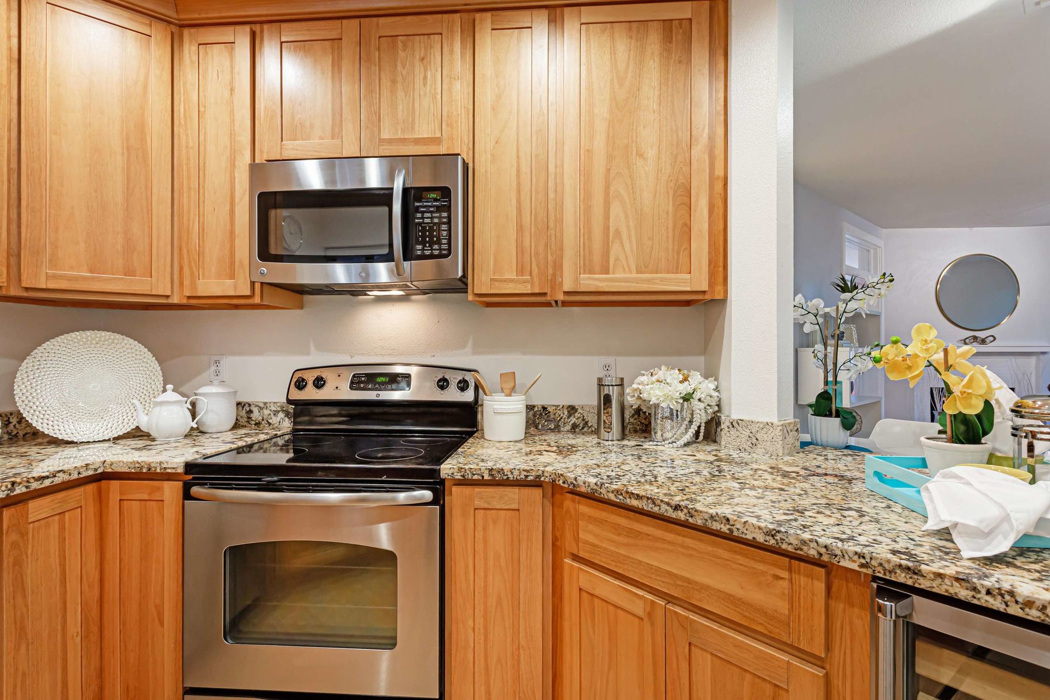 glass doors leading out to the patio. The efficient kitchen has granite