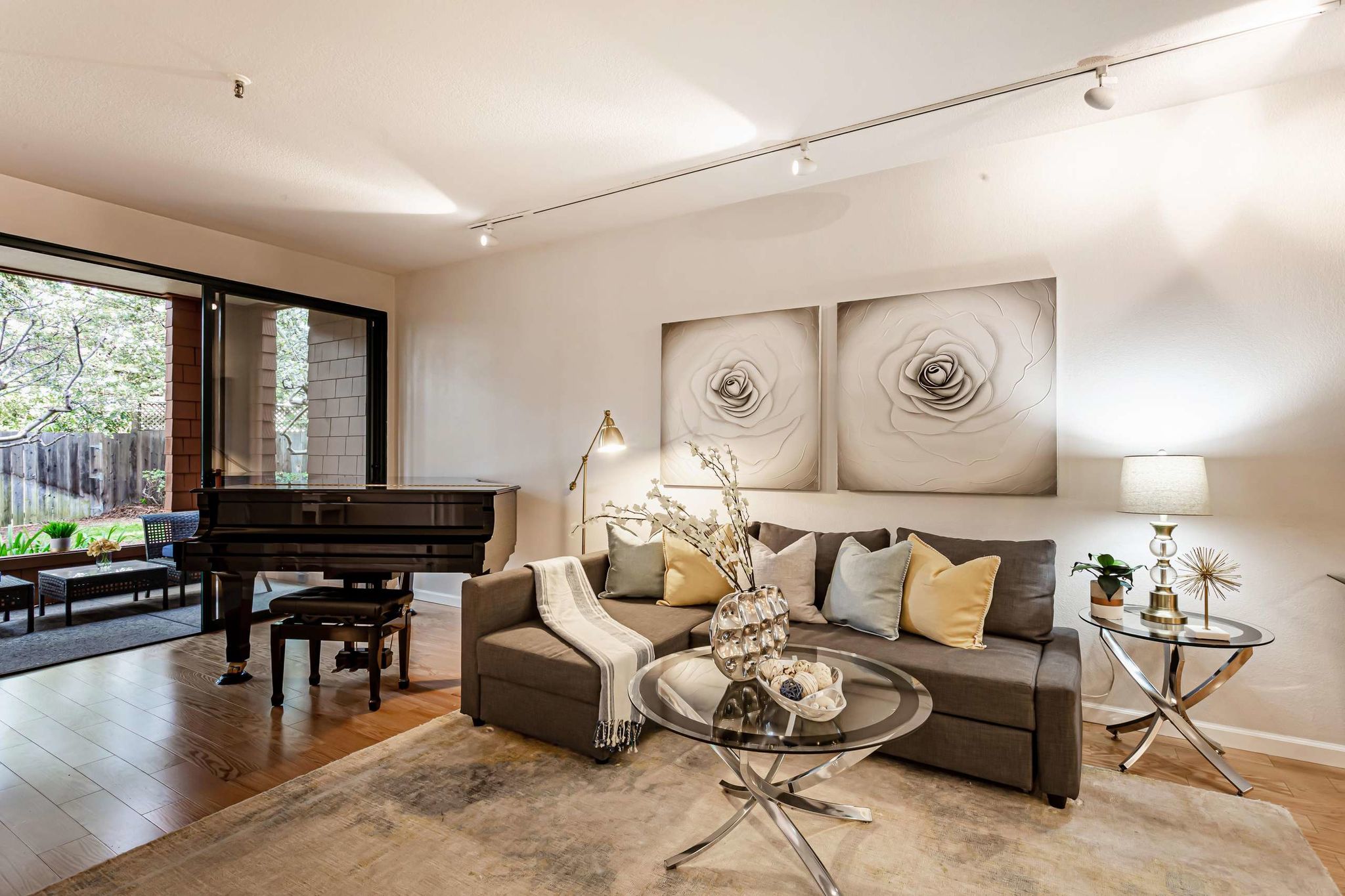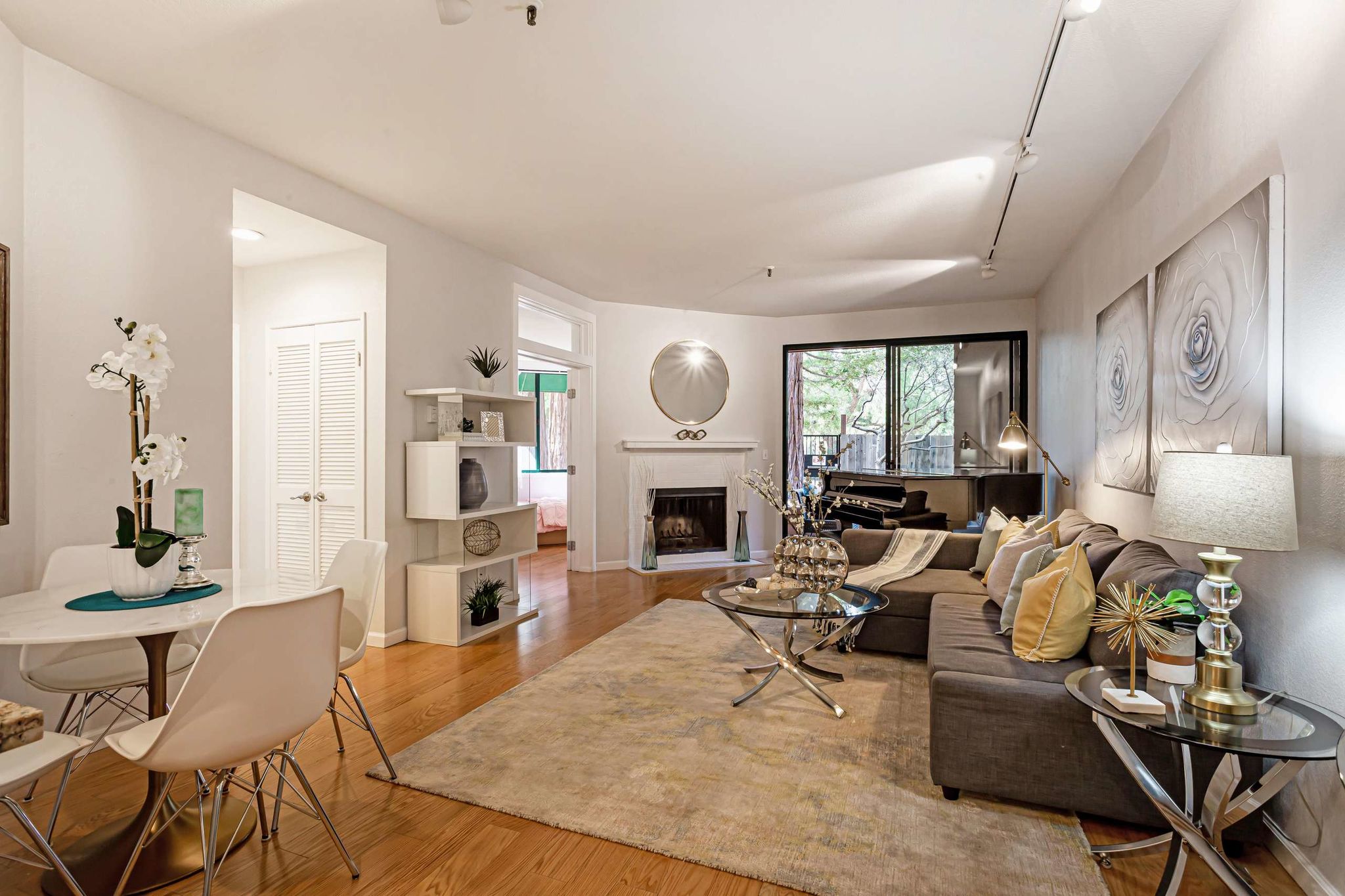 fireplace, hardwood floors, fresh paint, track lighting plus large sliding
