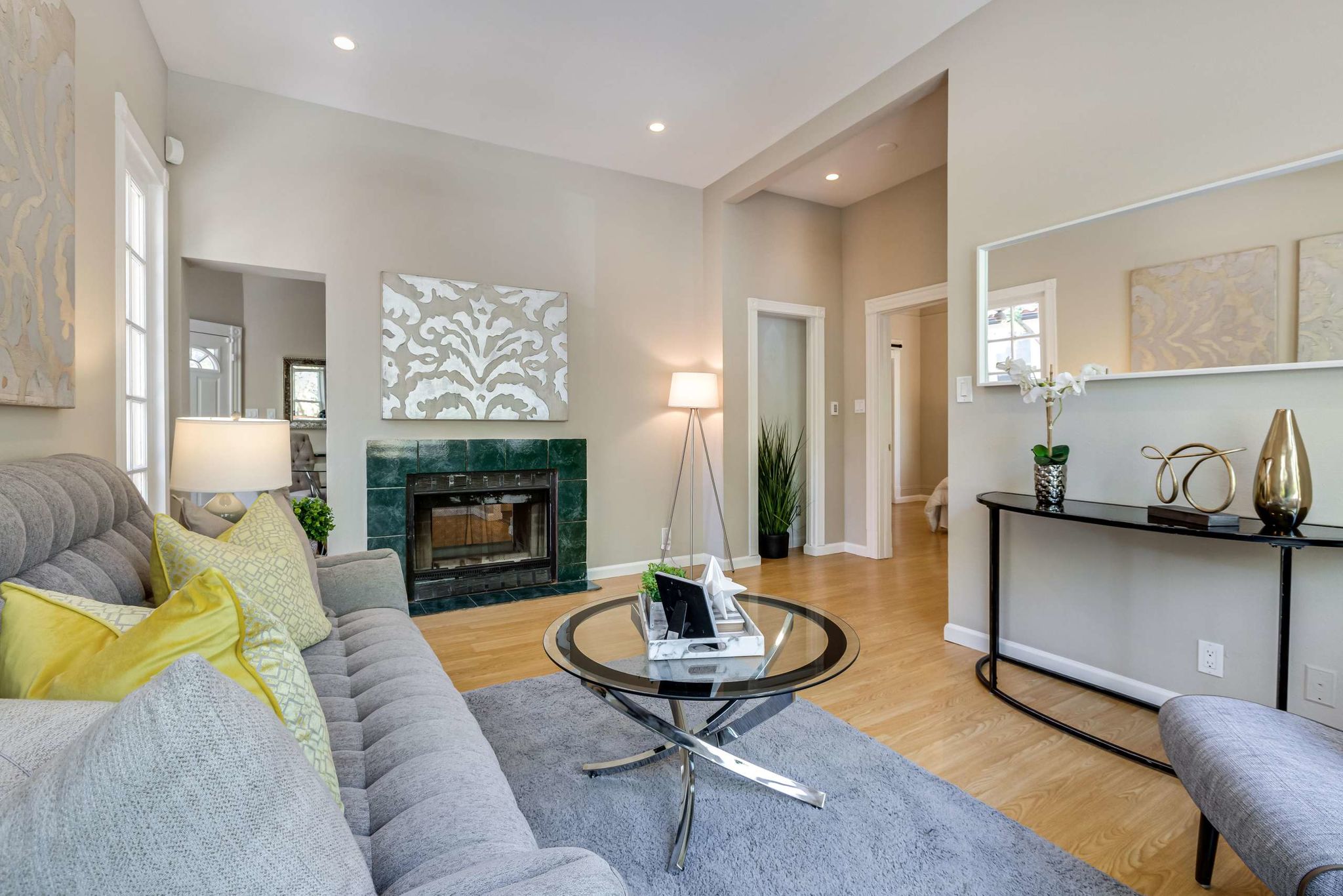 gracious living room has high ceilings, bay window & double-sided fireplace.