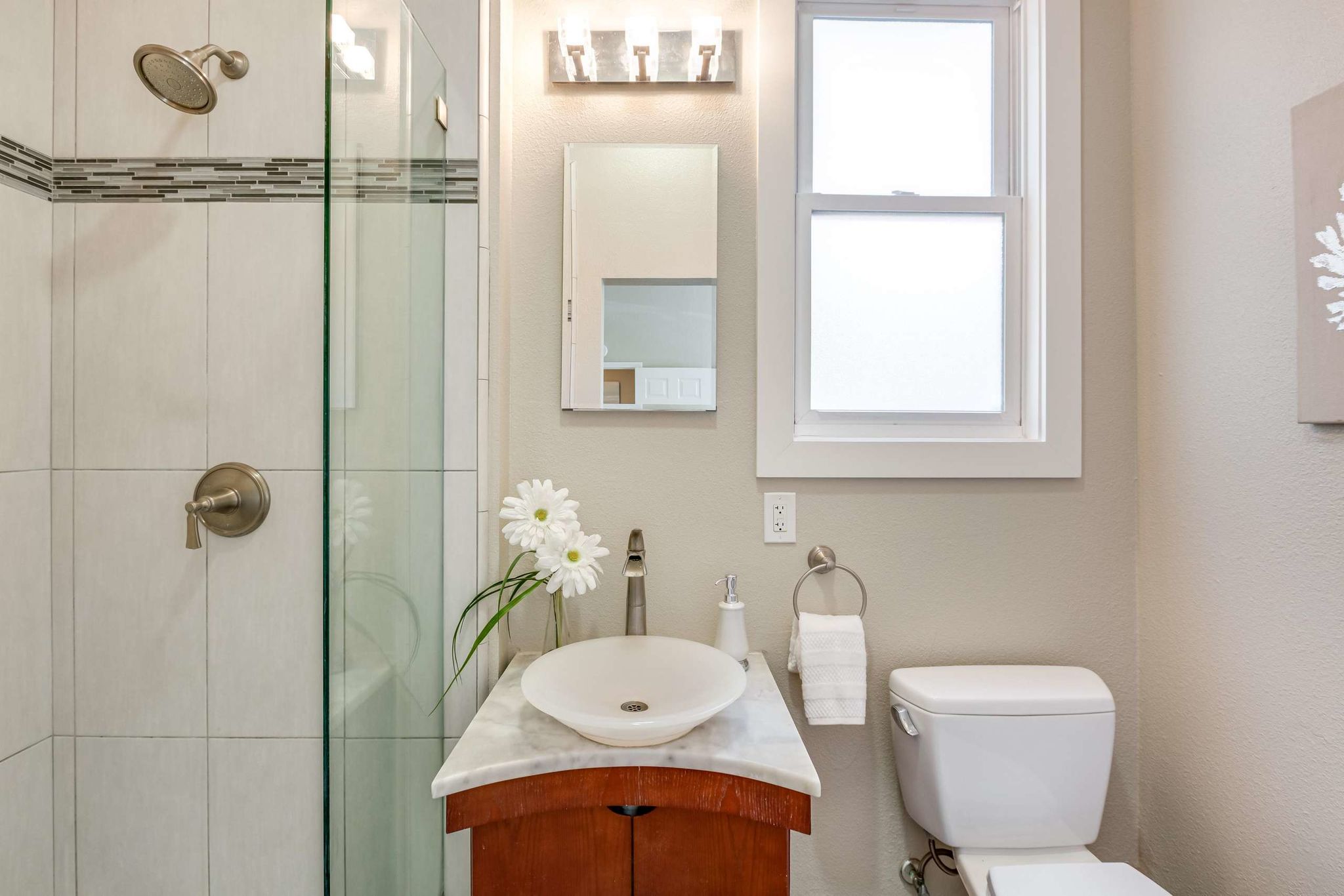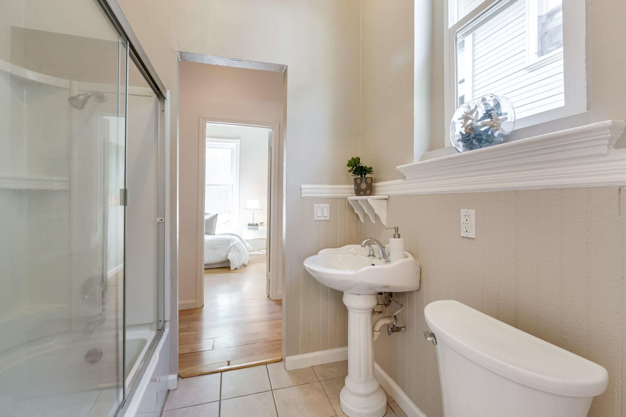 door to the remodeled bath with tiled shower. 2 other bedrooms, 1 of which